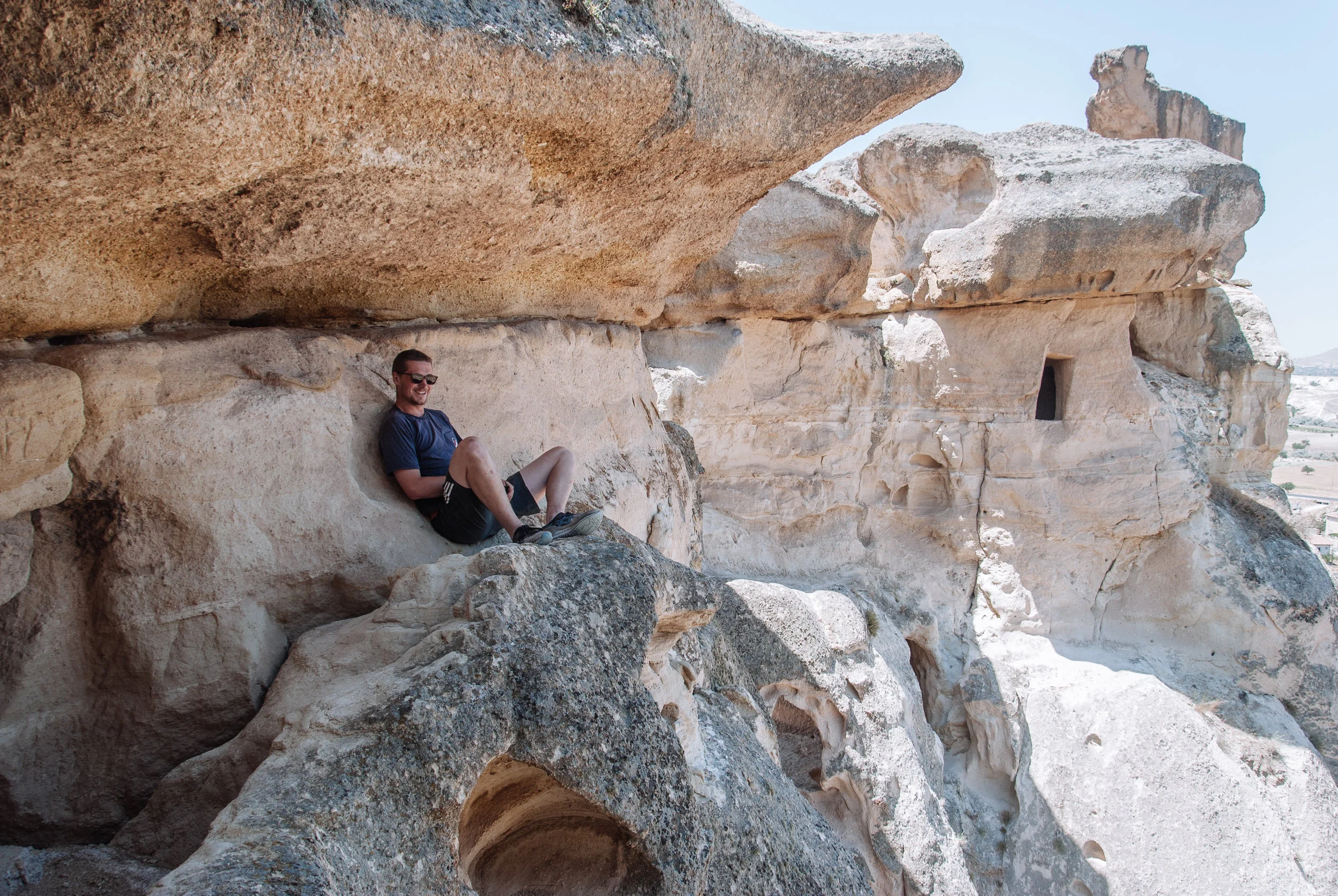 We're now in Cappadocia in central turkey. This area is characterised by its large red, white and brown valleys which have been eroded into beautiful and surreal shapes. The valley sides are speckled with caves from a centuries old civilisation who burrowed into the soft rock. Last night we found ourselves one of these caves to camp in - going to be hard camping spot to beat in terms of uniqueness.